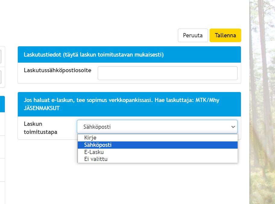 MTK:n jäsenlaskutuksessa otettiin käyttöön 5 euron paperilaskutuslisä vuoden 2024 alussa. Vältät laskutuslisän tilaamalla laskun sähköisesti joko e-laskuna verkkopankkiin tai suoraan sähköpostiisi. Jos sinulla on verkkolaskutusosoite, niin voit käyttää sitä. Huomioithan, että jos jäsenlaskun toimitustapa on kirje, paperilaskutuslisä tulee myös OmaPostiin lähetettäviin jäsenlaskuihin.