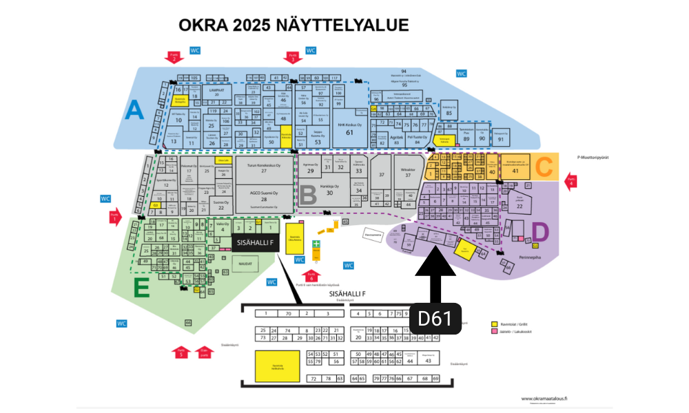 Löydät tarkemmat saapumisohjeet ja tietoa messuista täältä. Osastomme D61 on merkitty alla olevaan karttaan mustalla nuolella: