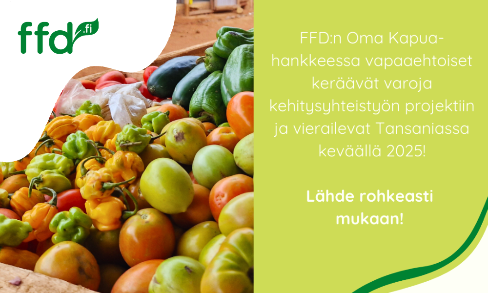 FFD:n Oma Kapua-kampanja käynnistyi toukokuussa 2024. Lähde nyt mukaan vapaaehtoiseksi keräämään varoja Tansanian pienviljelijöiden ilmastosopeutumisen vahvistamiseen ja matkusta FFD:n kanssa Tansaniaan huhtikuussa 2025.