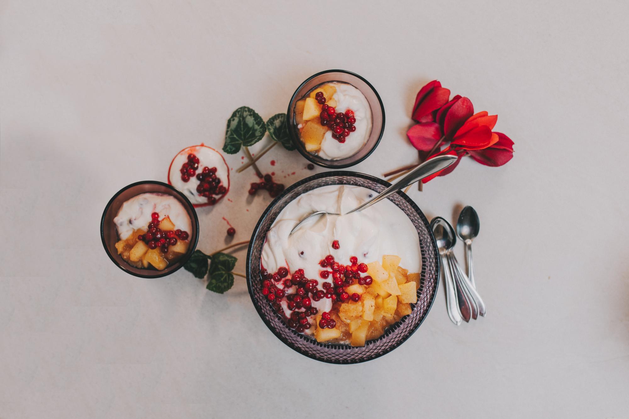 ◾ yhdistä kermavaahtoon rahka, marjat ja omenahilloke, maistele ja mausta vielä sokerilla, kanelilla, vaniljasokerilla tai piparkakkumausteella. Huomioi sokeria lisätessä, että hillokkeessa on jo sokeria.