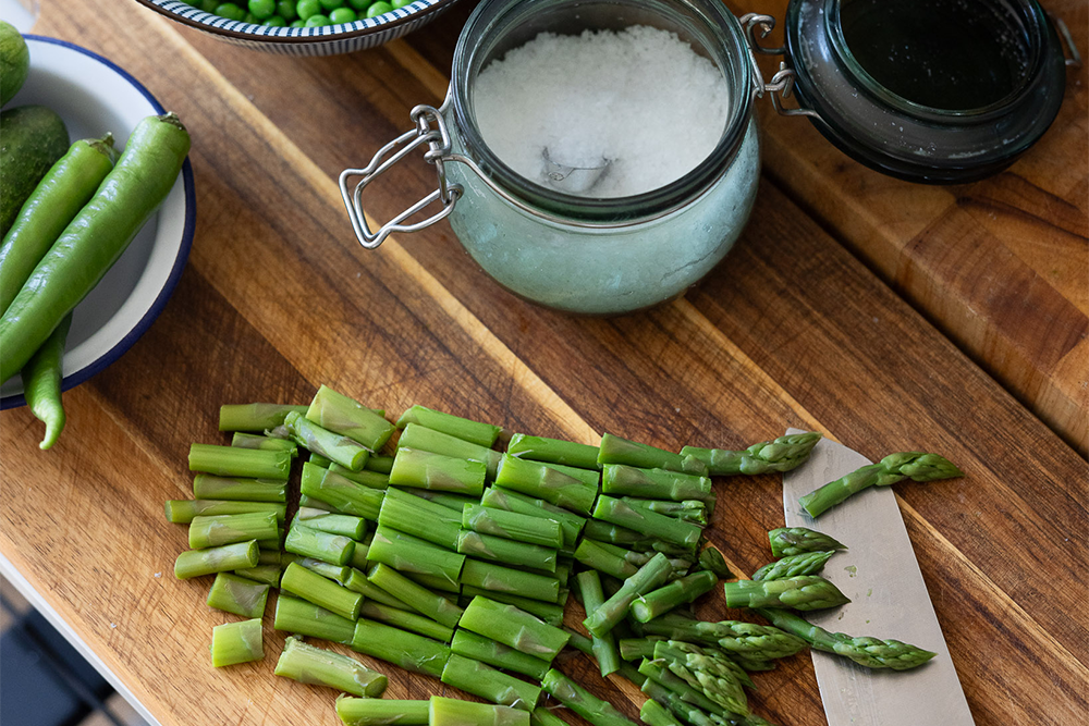 Huuhtele parsat ja napsauta puumaiset kannat pois. Keitä parsoja suolalla maustetussa vedessä, kunnes ne ovat kypsiä, mutta vielä napakoita (n. 3 min). Valuta ja anna jäähtyä. Leikkaa parsat reiluiksi suupaloiksi.