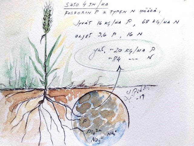 Kasvien fosfori- ja typpipitoisuuksien avulla voimme laskea, että 4 tonnin vehnäsato tarvitsee rakentuakseen fosforia 16 kiloa jyviin ja 3,6 kiloa olkiin. Hehtaarille. Yhteensä tällä rakennetaan se 8 tonnin maanpäällinen biomassa, joka oli hiilinielupotentiaalin lähtökohta viime viikon blogissani. Lisäksi tarvitaan yli kymmentä muuta välttämätöntä kasvinravinnetta, biologisin perustein. Ravinteet otetaan juuriston avulla ja lyhyessä ajassa, joten maahiukkasten pidätyspinnoilla ja maanesteessä riittää ravinnevirtaa kasviin: