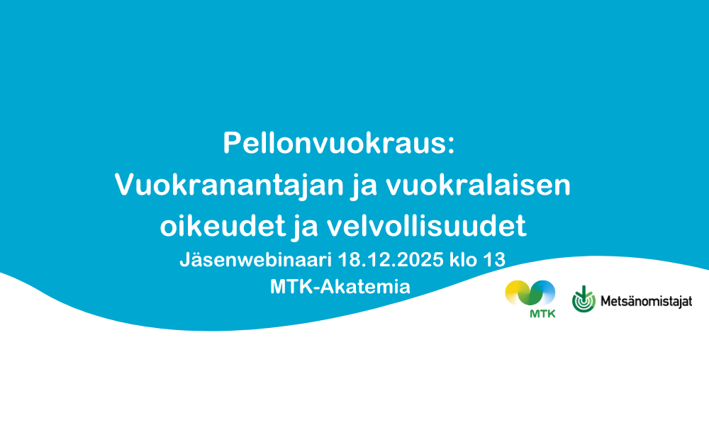 Pellonvuokraus-jäsenwebinaarissa käydään läpi pellonvuokraukseen liittyviä oikeuksia ja velvollisuuksia vuokranantajan ja vuokralaisen näkökulmasta. Asiantuntijana webinaarissa on Kimmo Tammi, joka työskentelee maatalous- ja elintarvikemarkkinajuristina MTK:ssa.