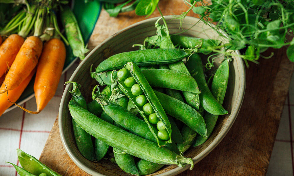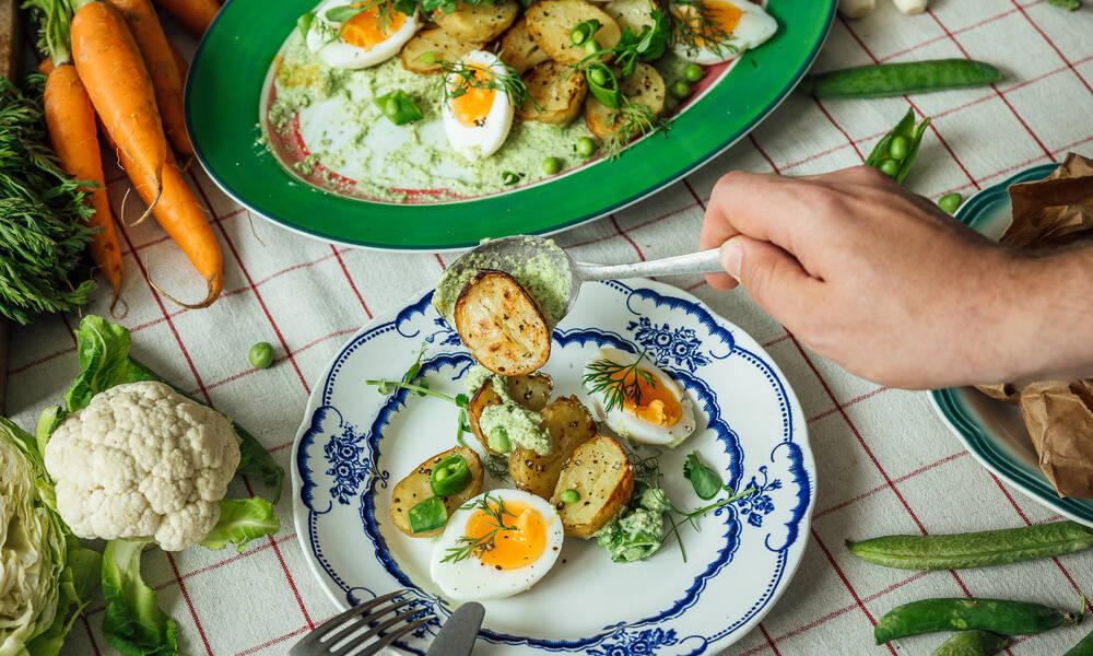 - Levitä hernekastike tarjoiluvadille tai lautasille. Nosta päälle paahdetut perunat ja kananmunat. Pilko tuoreet herneet palkoineen ja ripottele salaatin pinnalle. Lisää vielä hienonnettua tilliä ja koristele herneenversoilla.