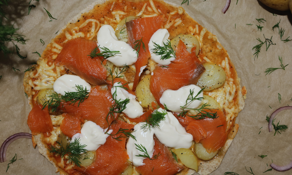 - Paista pizza. Lisää lohta, tilliä sekä ranskankermanokareita kypsän pizzan päälle.