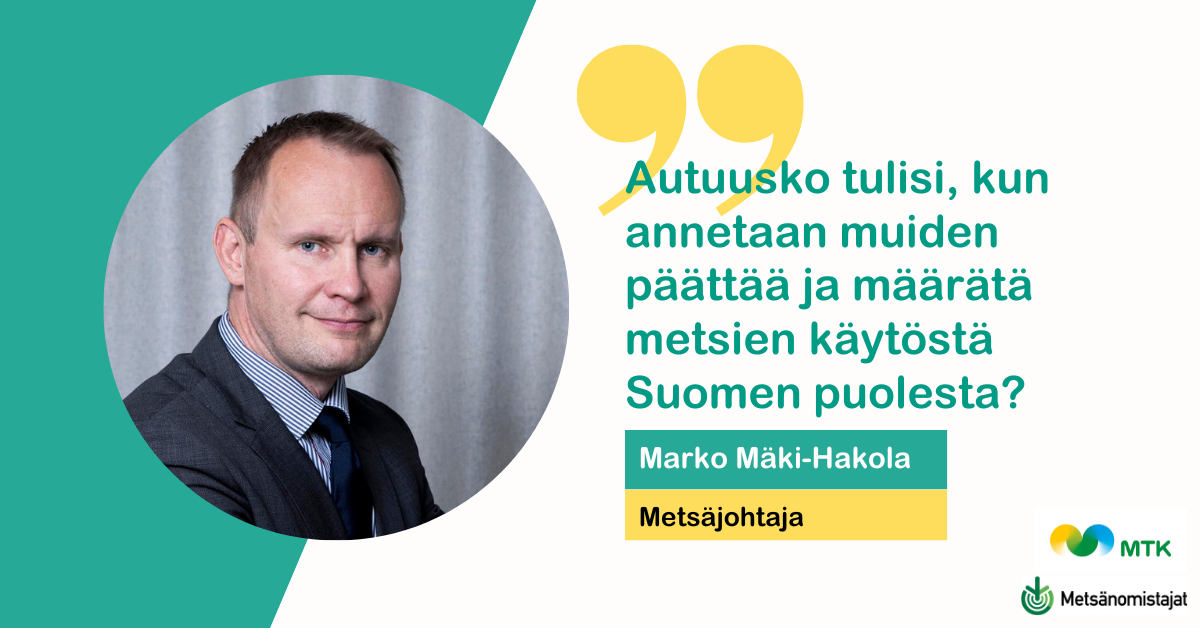 Paranevan luonnontilan ja luonnon monimuotoisuuden on oltava kaikkien yhteinen tavoite. Sen eteen on tehtävä yhdessä viisaasti töitä. Viime vuodet luontoasioista on kuitenkin tehty kärjistettyjä, populistisia lyömäaseita. Arjen päivittäiset luonto- ja ilmastoteot sekä metsänomistajien alati lisääntyvät monimuotoisuuspanostukset eivät saa ansaitsemaansa arvoa ja kiitosta, lieneekö taustalla ymmärryksen puute vai tarkoitushakuisuus. Vihreän laidan politiikan keinot olisivat myrkkyä ilmastonmuutosta vastaan taistelussa, pohtii MTK:n metsäjohtaja Marko Mäki-Hakola.