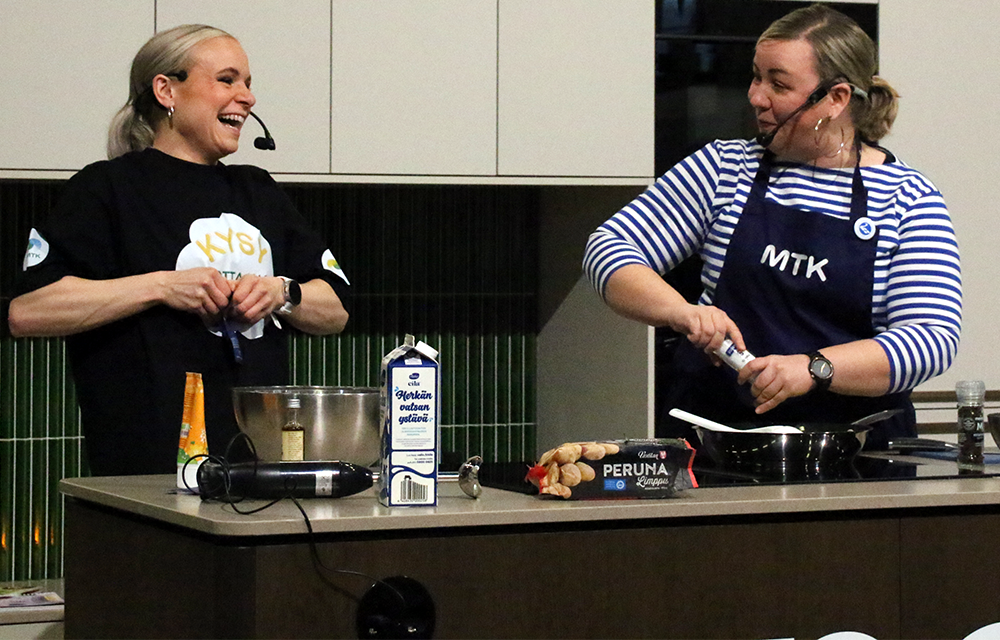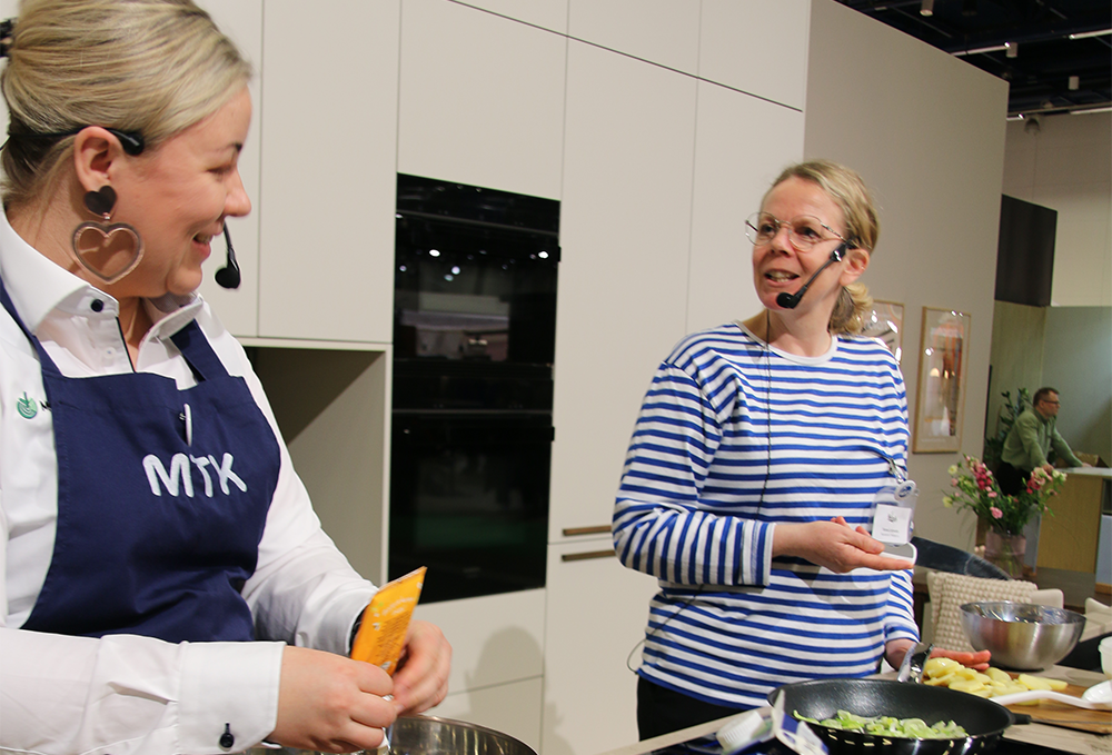 Heidi Siivonen isännöi lauantaina näytöskeittiössä vieraanaan maanviljelijä, kilpajuoksija Kaisa Honkaharju. Yhdessä he esittelivät yleisölle marjapiirakkasmoothien ja perunamunakkaan valmistusta.