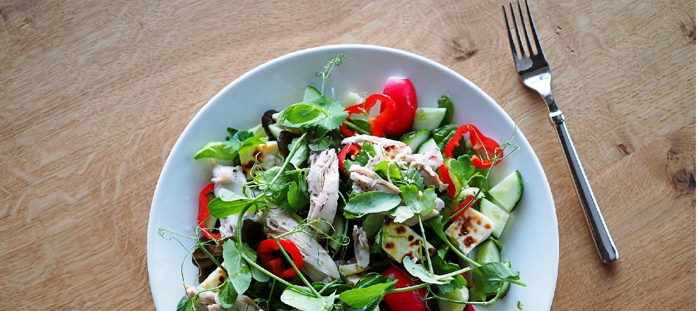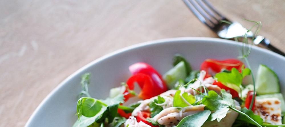 Kuumenna uuni 180 asteeseen. Asettele broilerin koipireidet vuokaan ja hiero pintaan mausteet sekä öljy. Paahda noin 45 minuuttia tai kunnes liha on kypsää (voit kokeilla leikkaamalla lihaa paksuimmasta kohdasta). Poista broilerin nahka, irrota liha luista ja revi suikaleiksi kahdella haarukalla. Huuhtele ja pilko kaikki vihannekset, sekoita kulhossa ja mausta öljyllä, viinietikalla ja suolalla. Lisää kuutioitu leipäjuusto ja broileri. Tarjoile tuoreen lehtipersiljan ja herneenversojen kanssa.