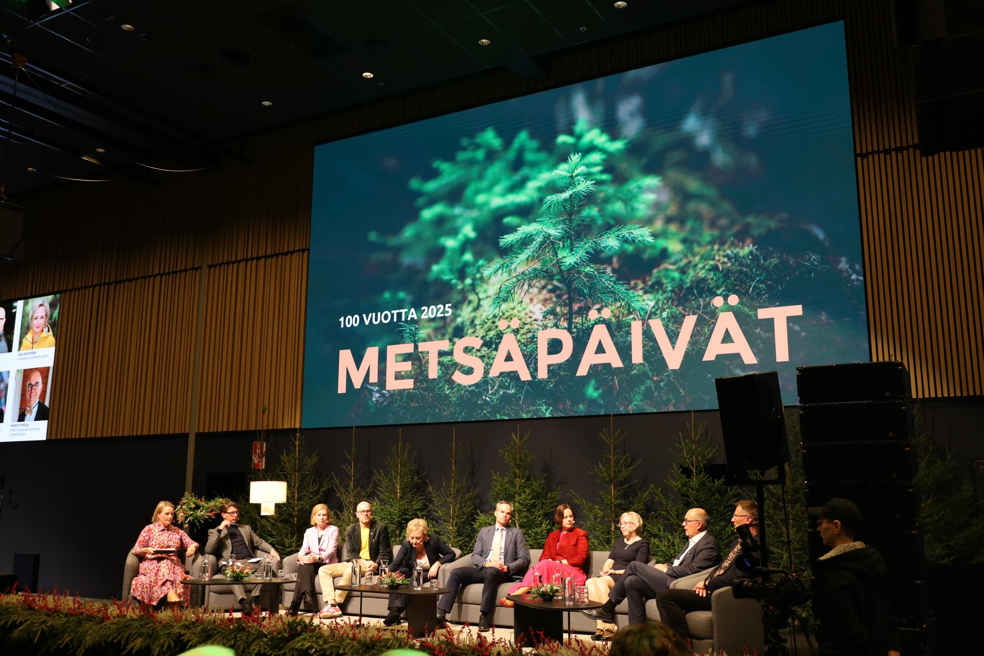 Suuressa metsäkeskustelussa panelisteina toimivat metsänomistaja Kaisa Ralli, MTK:n metsävaltuuskunnan puheenjohtaja Mikko Tiirola, Luonnonvarakeskuksen tutkimusjohtaja Antti Asikainen, maa- ja metsätalousministeriön metsäneuvos Erno Järvinen, MEP Elsi Katainen, Metsäteollisuus ry:n toimitusjohtaja Paula Lehtomäki, ympäristö – ja ilmastoministeri Kai Mykkänen sekä Koneen säätiön Metsän puolella -hankkeen muutosjohtaja Mari Pantsar.