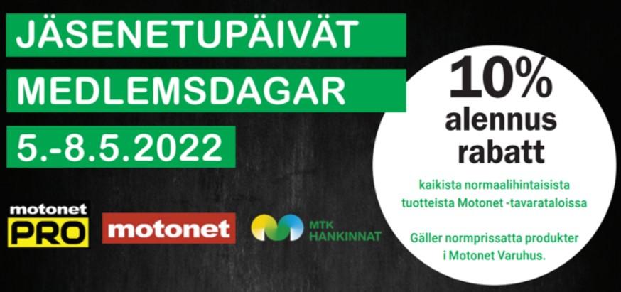Päivien aikana löydät vain jäsenille tarkoitettuja kampanjatuotteita kaikista Motonet-tavarataloista. Saat myös 10 % alennuksen kaikista normaalihintaisista tuotteista. Alennus koskee kaikkia jäseniä – oli Motonet-yritystili avattuna tai ei. Lisäksi liittymisetuja MotonetPro-yritysasiakkuuden tavarataloissa avaaville jäsenille. Lisätietoja täältä.