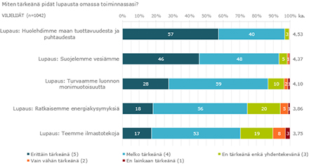 Jäsenkysely pohjautui MTK:n ympäristölupauksiin. Tärkeimmäksi lupaukseksi koetaan ”Huolehtiminen maan puhtaudesta ja tuottavuudesta”, ja toisena on lupaus ”Suojelemme vesiämme”. Vesiensuojelu toteutuu omassa toiminnassa parhaiten ja toisena maan tuottavuuden ja puhtauden huolehtiminen, kolmantena luonnon monimuotoisuuden turvaaminen.