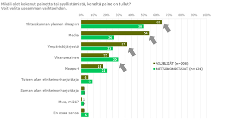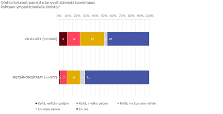 Puolet viljelijöistä kokee painetta omaa toimintaa kohtaan lähinnä yleisen ilmapiirin ja median kautta. Tiukemmalle ympäristölainsäädännölle ei koeta tarvetta varsinkaan, jos seurauksena on kustannuksia tai tulonmenetyksiä. Tuotantotalouteen liittyvät investoinnit menevät ympäristöinvestointien edelle. Omaisuudensuoja-asioissa kaivataan enemmän mahdollisuutta itse vaikuttaa asioihin. Jos toimintaa rajoitetaan, kaivataan kohtuullisia korvauksia.