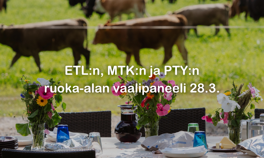 ETL, MTK ja PTY järjestävät yhteisen ruoka-alan vaalipaneelin perjantaina 28. maaliskuuta. Eduskuntapuolueiden paneelissa keskustellaan ruoka-alan merkityksestä ja sen menestykseen vaikuttavista tekijöistä. Tule seuraamaan lähetystä klo 9.00 alkaen.