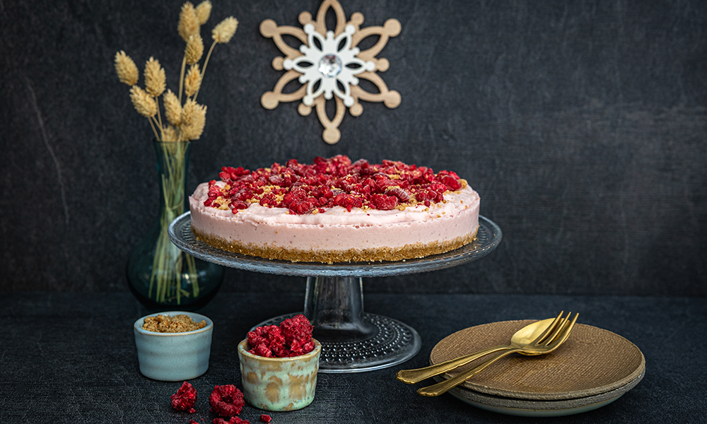 Irrota kakku varovasti vuoasta ja koristele pinta keksimuruilla ja kuivatulla vadelmilla. Lisää pakastevadelmat juuri ennen tarjoilua.