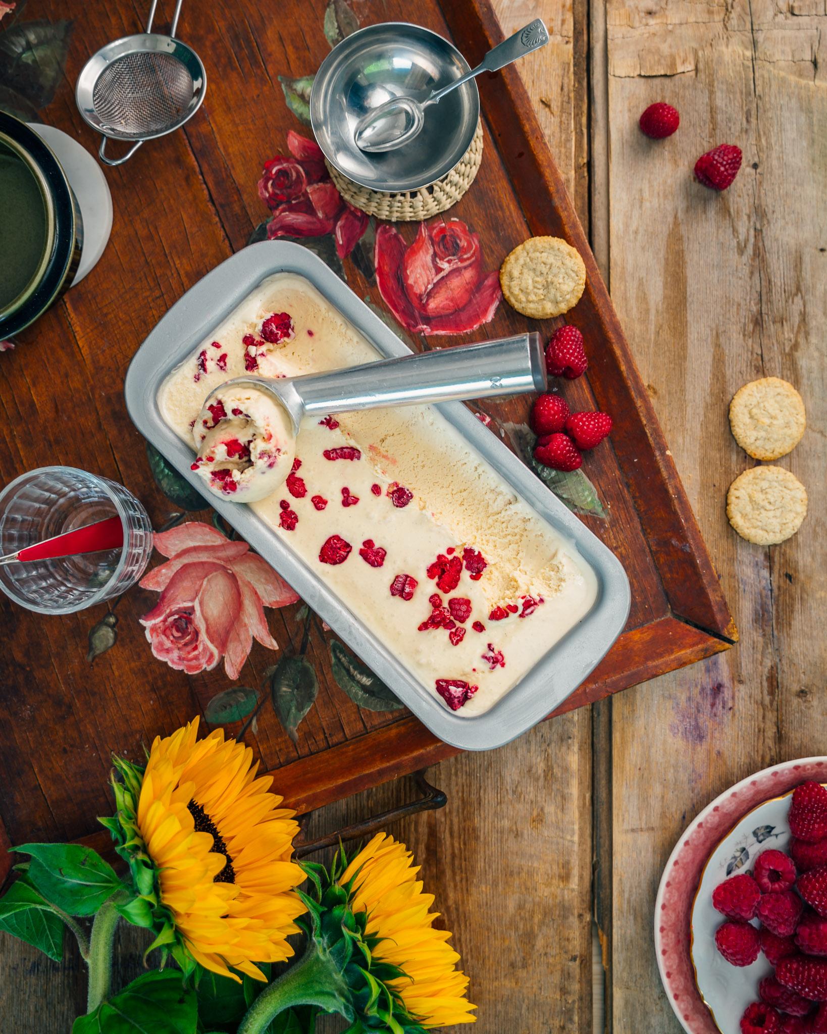 Vinkki: jos haluat jäätelöstä punaisen sävyistä, voit kypsentää vadelmat kevyesti kattilassa, soseuttaa ne ja lisätä jäähtyneitä massan joukkoon. Jos et halua siemeniä jäätelön joukkoon voit paseerata kypsennetyt vadelmat siivilän läpi ennen massan joukkoon lisäämistä.