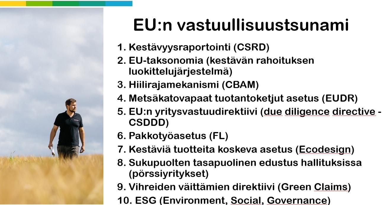 Elintarvikemarkkinoilla ensimmäinen vaihe muutoksessa oli, kun Pellolta pöytään -strategian toteuttamiseen luotiin komission terveyspääosaston johdolla mallisääntöjä liitettäväksi hankintasopimuksiin. Puhuttiin code of conduct -vaatimuksista. Nyt yritykset tuottavat yritysvastuuraportointidirektiivin velvoittamana tilinpäätökseen tilinpäätöslukujen lisäksi informaatiota muiden velvoitteiden, kuten tuotantoketjun metsäkatovapauden, täyttämisestä.