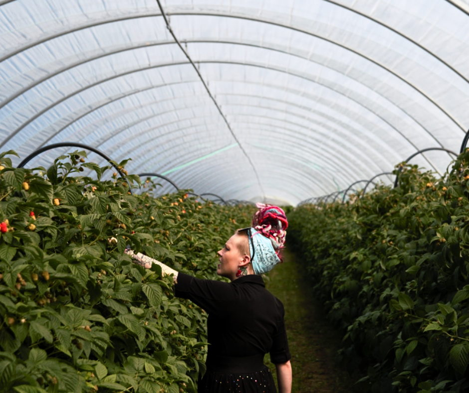 Kuva: Kirsi Seppänen etsi täydellisiä vadelmia tunnelikasvihuoneen varjossa