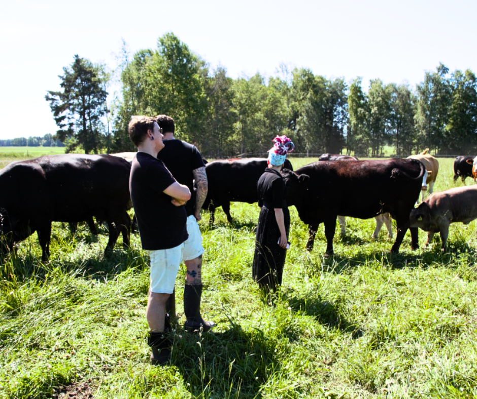 Matka jatkui Espoosta Hämeenlinnaan, jossa tennarit vaihdettiin kumisaappaisiin ja Hirvilammen luomutilan emäntä Susanna Valtonen johdatti ryhmän pellolle. Vastassa odotti lauma nautoja, jotka mutustivat rauhallisesti nurmea auringon paisteessa. Erityisen kiinnostuneita tulokkaista olivat porukan vasikat, säyseäksi osoittautunut Reino- sonni taasen nautti saamistaan rapsutuksista. Reino on emolehmätilalle tärkeä, sillä on Valtosen mukaan jo noin sata jälkeläistä.