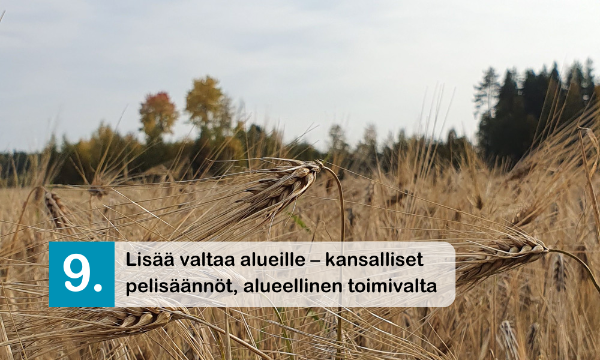 Maaseutu ja maaseudun resurssit ovat Suomen vahvuuksia. Tulevassa hallitusohjelmassa maaseutu on nähtävä kasvun moottorina. Politiikan on muututtava mahdollisuuksien luojaksi. Hallituksella ja eduskunnalla on vastuu hakea yhdessä ratkaisuja niin kotimaassa, EU:ssa kuin kansainvälisilläkin kentillä.