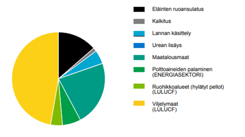 kotieläinten ruoansulatuksen CH4-päästöt, lannankäsittelyn CH4- ja N2O-päästöt, maaperän N2O-päästöt, kasvintähteiden pellolla polton N2O-päästöt sekä kalkituksen ja urealannoituksen CO2-päästöt