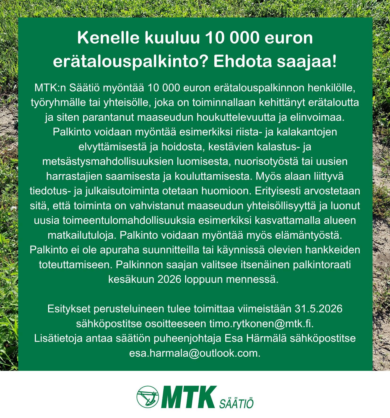 | MTK:n Säätiön asiamies Timo Rytkönen timo.rytkonen (at) mtk.fi |