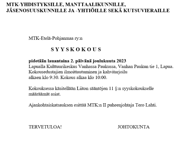 MTK-Polvijärvi syyskokous 24.11. klo 11 alkaen Polvijärven teknisen toimiston kokoustila